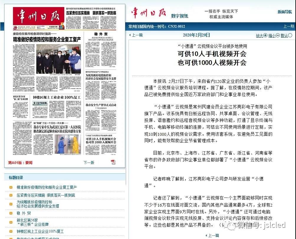 隨后進行了座談會,大家進行深度交流。章總對各位領導到來表示歡迎,并向領導們介紹了江蘇亮彩和利亞德戰略合作關系,作為利亞德集團江蘇省級工程商、會議商顯江蘇總運營商。公司主營的版塊:智能顯示、智慧城市終端、會議商顯、夜景照明、文化旅游、AR/VR娛樂、供電系列。2020年2月29日,常州日報頭版報道了疫情期間,“江蘇亮彩”旗下“小德通”云視頻會議平臺被多地免費使用,助力企事業單位線上辦公會議,同時也加快了視頻會議替代傳統現場會議的腳步。